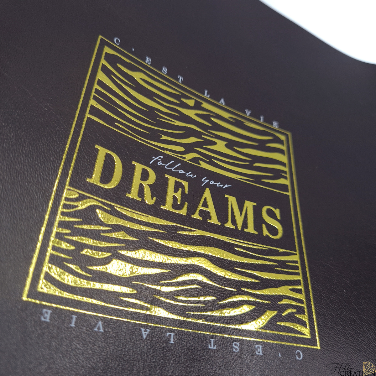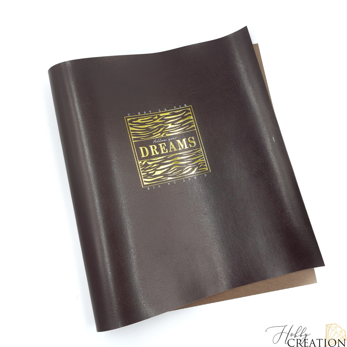 - Кожзам с принтом "Follow your dreams / золото" 26*46 см. глянцевый К2, горький шоколад